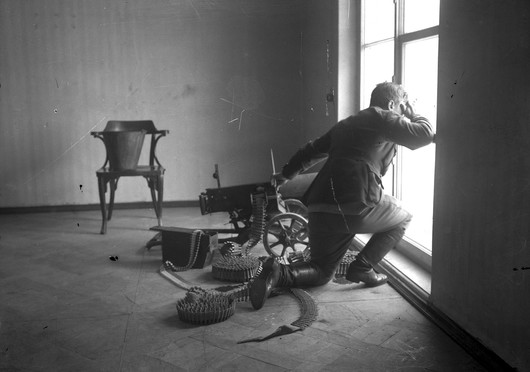 A machine gunner looking through a window at his position near the Kremlin, Moscow, Russia, October 1917. (AP Photo)