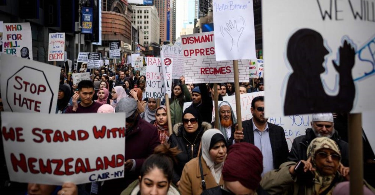 Demonstrators take part in a protest against growing Islamophobia, white supremacy and anti-immigrant bigotry following the New Zealand mosque attacks, at in Times Square, New York City, the U.S.