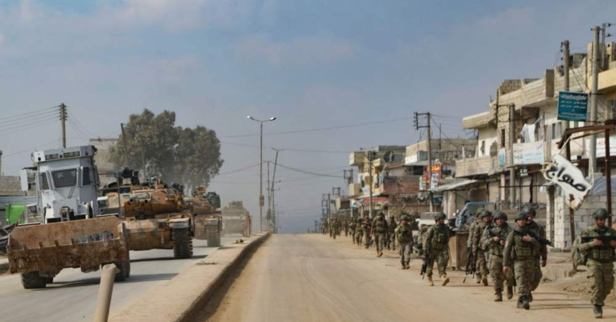 Turkish troops patrol on foot and in military vehicles in the town of Atareb in the western countryside of Syria's Aleppo province, Feb. 19, 2020. (AFP Photo)
