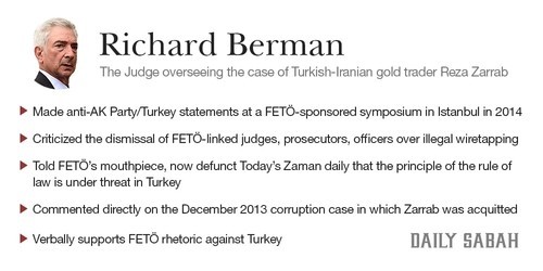 Richard Berman, the judge overseeing the case in New York, came to Turkey after the failure of the FETÖ-led Dec. 17-25 2013 operations, the so-called "corruption inquiry" which was a plot perpetrated by the FETÖ to topple the democratically-elected government. He arrived in Istanbul shortly after the incident to attend a symposium on "justice and the rule of law," organized by the FETÖ-linked Yüksel Karkın Küçük Attorney Partnership. In the symposium, Berman targeted the ruling Justice and Development Party (AK Party) government and claimed that Turkey was governed by a "one man rule" and suggested that the current administration must be changed — ideas which were consistently propagated by FETÖ supporters. Berman even criticized the dismissal of FETÖ-linked judges, prosecutors and police officers over unlawful wiretapping charges.