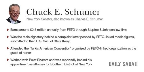 Schumer was also the main signatory behind a complaint letter penned by FETÖ-linked Zaman daily's editor-in-chief Ekrem Dumanlı and Samanyolu TV-owner Hidayet Karaca, submitted to then-U.S. Secretary of State John Kerry.