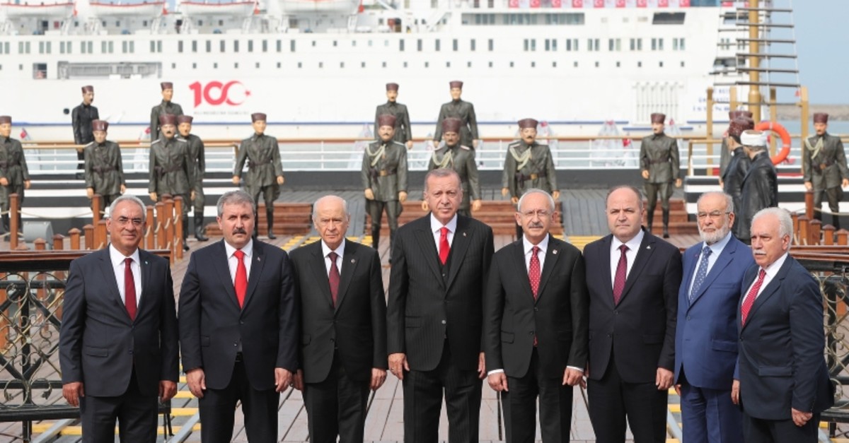 President Erdou011fan (C) poses with leaders of Turkey's political parties after the special ceremony marking 100th anniversary of Turkish Independence Day, Samsun, May 19, 2019. (AA Photo)