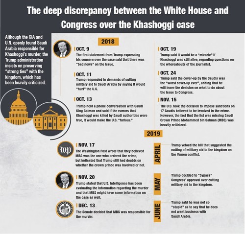 The CIA also concluded last October that MBS ordered the assassination of Khashoggi. However, Trump disputed the CIA report and told reporters: "The CIA points it both ways. Maybe he did, maybe he didn't," a phrase he had used in a controversial statement released on the incident. When a reporter asked who should be held responsible for the killing, Trump responded, "Maybe the world should be held accountable cause the world is a vicious place."