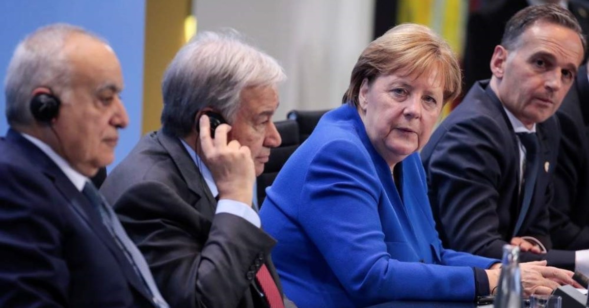 Special Representative and Head of the United Nations Support Mission in Libya (UNSMIL) Ghassan Salame; Secretary-General of the United Nations (UN) Antonio Guterres; German Chancellor Angela Merkel and German Foreign Minister Heiko Maas give a press conference at the end of a Peace summit on Libya at the Chancellery in Berlin, Jan.19, 2020. (AFP PHOTO)