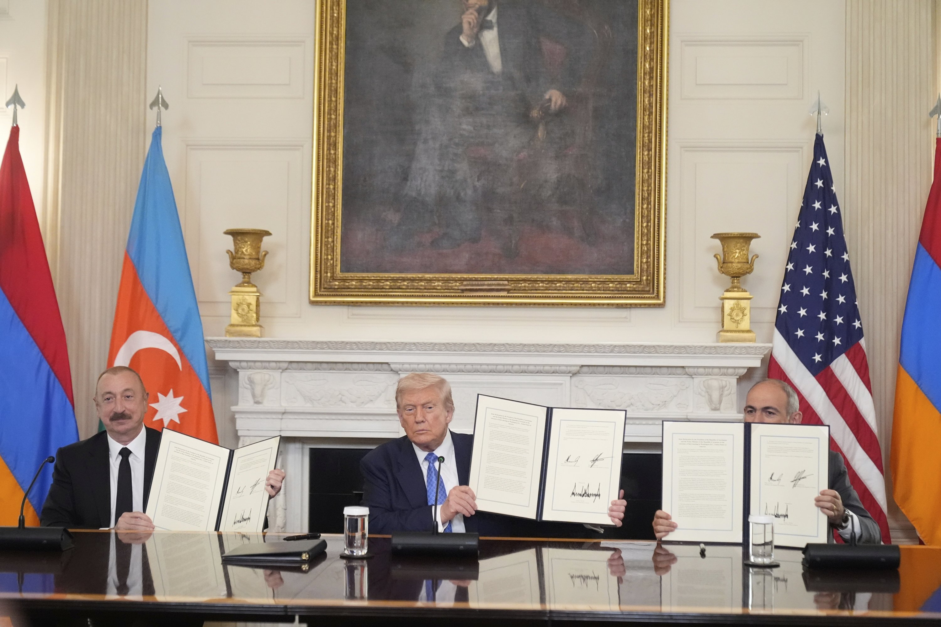 President Donald Trump (C), joined by Armenian Prime Minister Nikol Pashinyan (R), and Azerbaijan President Ilham Aliyev holds a signed trilateral agreement during a ceremony in the State Dining Room of the White House, in Washington DC, U.S.,  Aug. 8, 2025. (AP Photo)