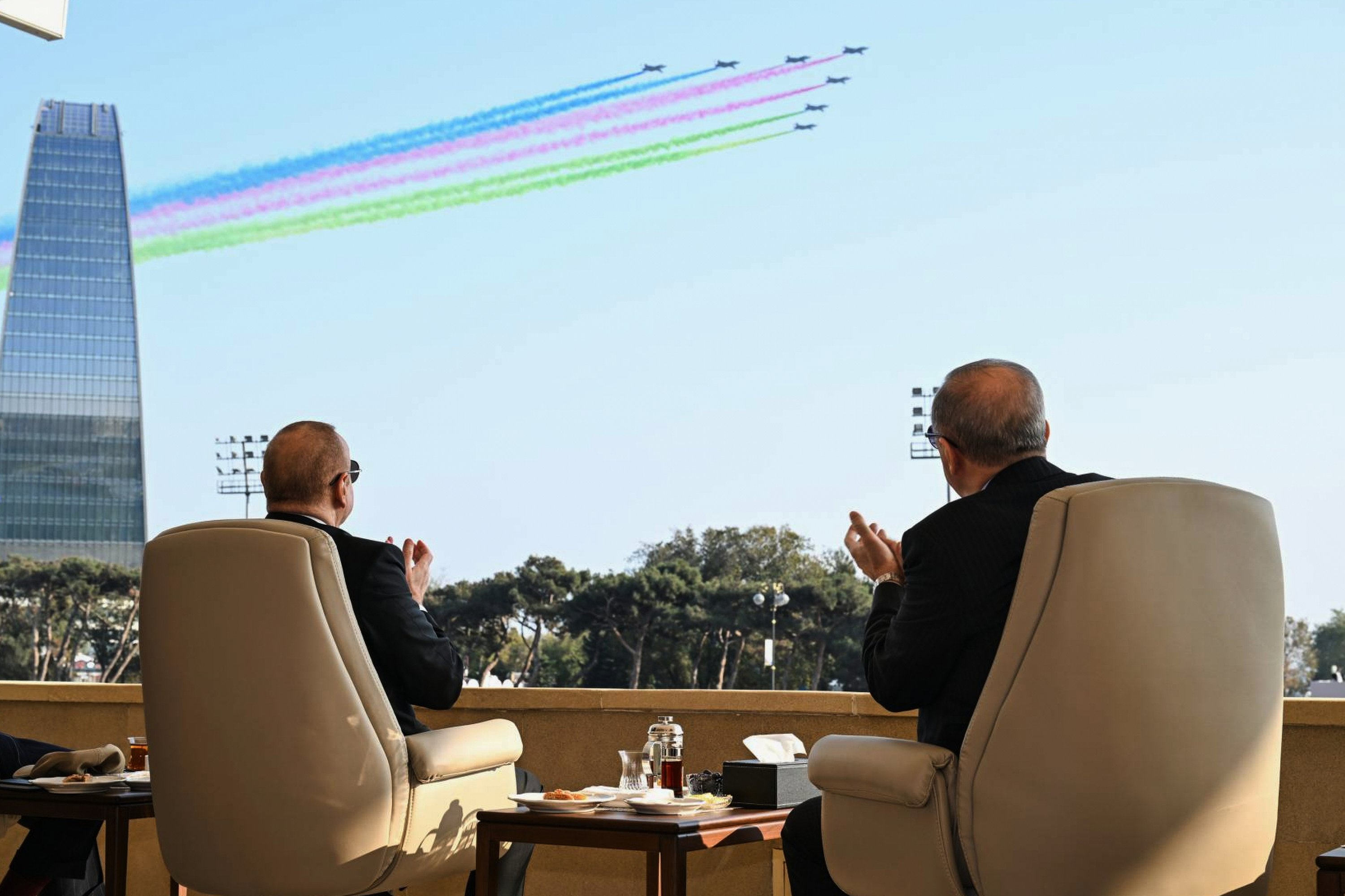 Azerbaijani President Ilham Aliyev (L) and President Recep Tayyip Erdoğan watch a military parade, Baku, Azerbaijan, Nov. 8, 2025. (AP Photo)