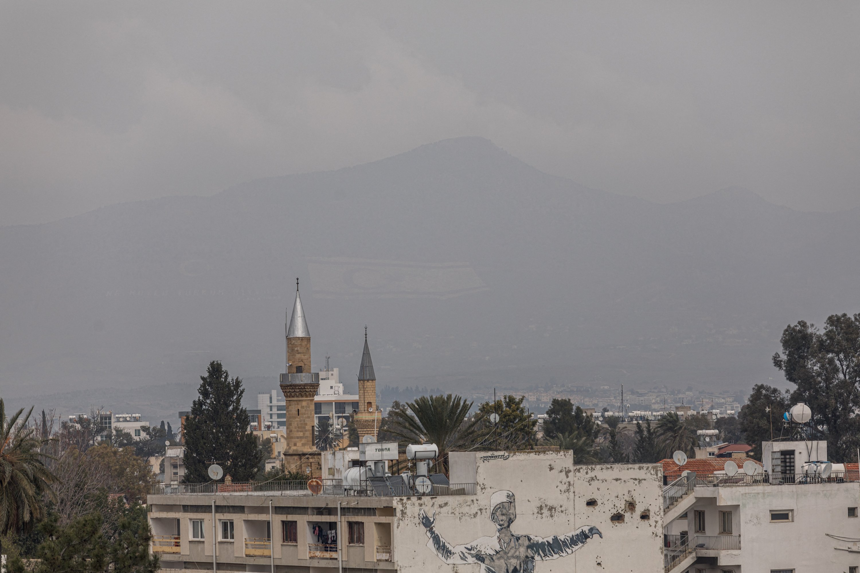 The flag of the Turkish Republic of Northern Cyprus is visible on Beşparmak (Pentadaktylos) mountain behind a mosque minaret in Lefkoşa, Feb. 12, 2024. (AFP File Photo)