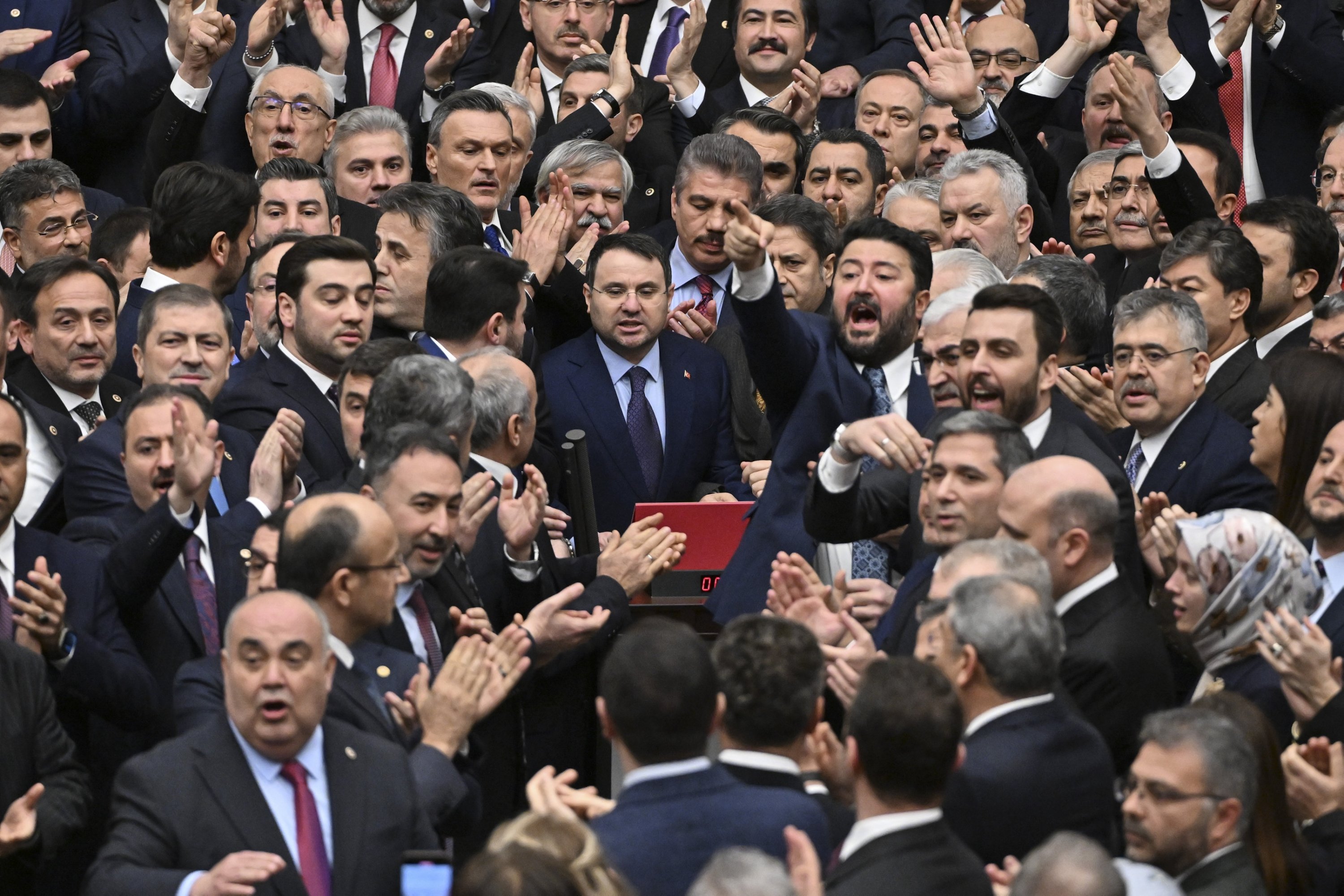 Akın Gürlek, who succeeded Yılmaz Tunç as justice minister, arrived at Parliament on Wednesday to be formally sworn in, but CHP lawmakers suddenly leapt to the pulpit where he would recite the oath, effectively stopping him. Lawmakers from the ruling Justice and Development Party (AK Party) rushed to Gürlek's side, and a brawl erupted between Mahmut Tanal of the CHP and Osman Gökçek of the AK Party. Other lawmakers traded blows, too, while AK Party deputies surrounded Gürlek, shielding him from CHP members hurling objects at him.
