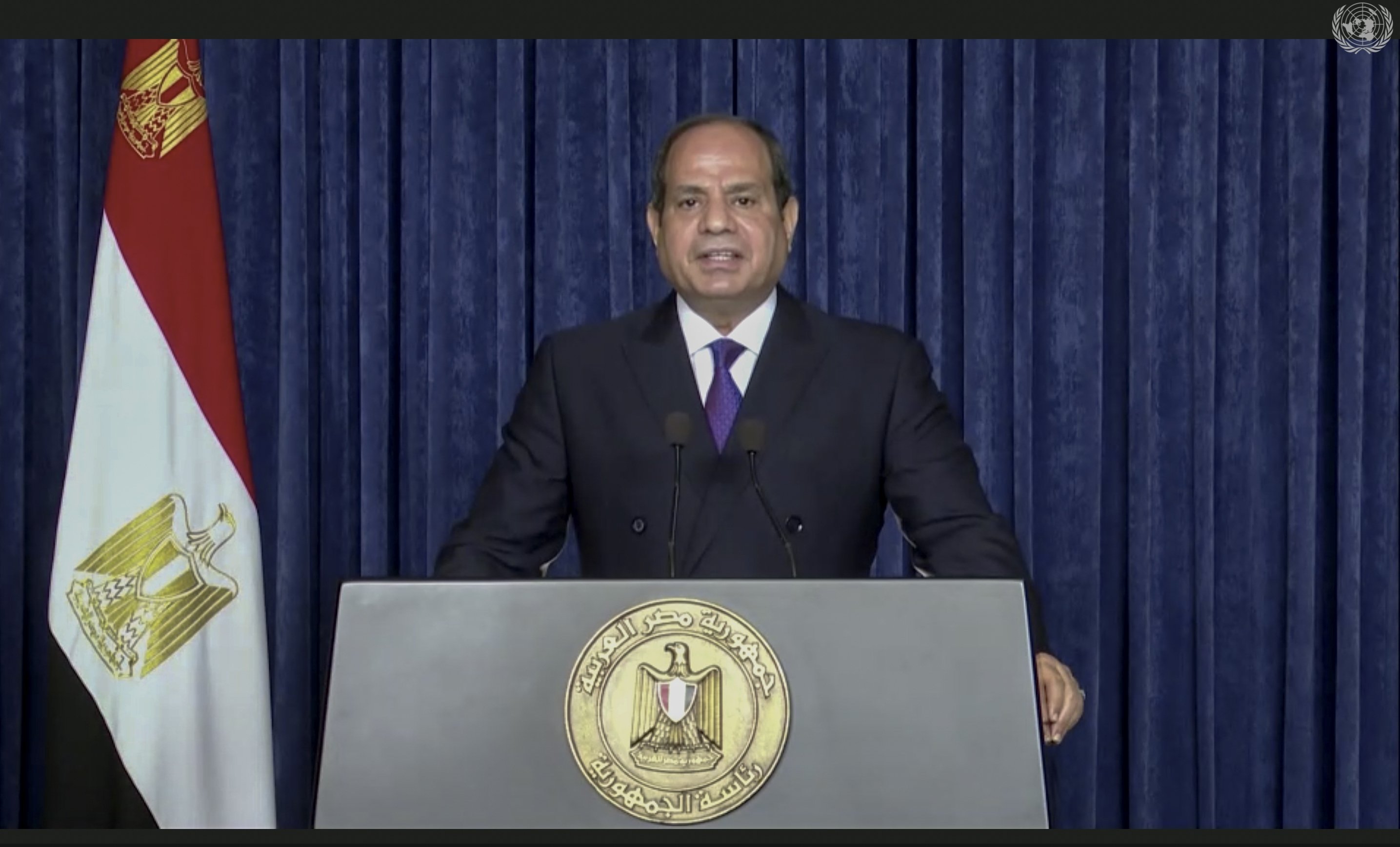 In this image taken from a UNTV video, Egyptian President Abdel-Fattah el-Sissi speaks in a prerecorded message that was later played during the 75th session of the United Nations General Assembly at U.N. headquarters in New York, Sept. 22, 2020. (AP Photo)