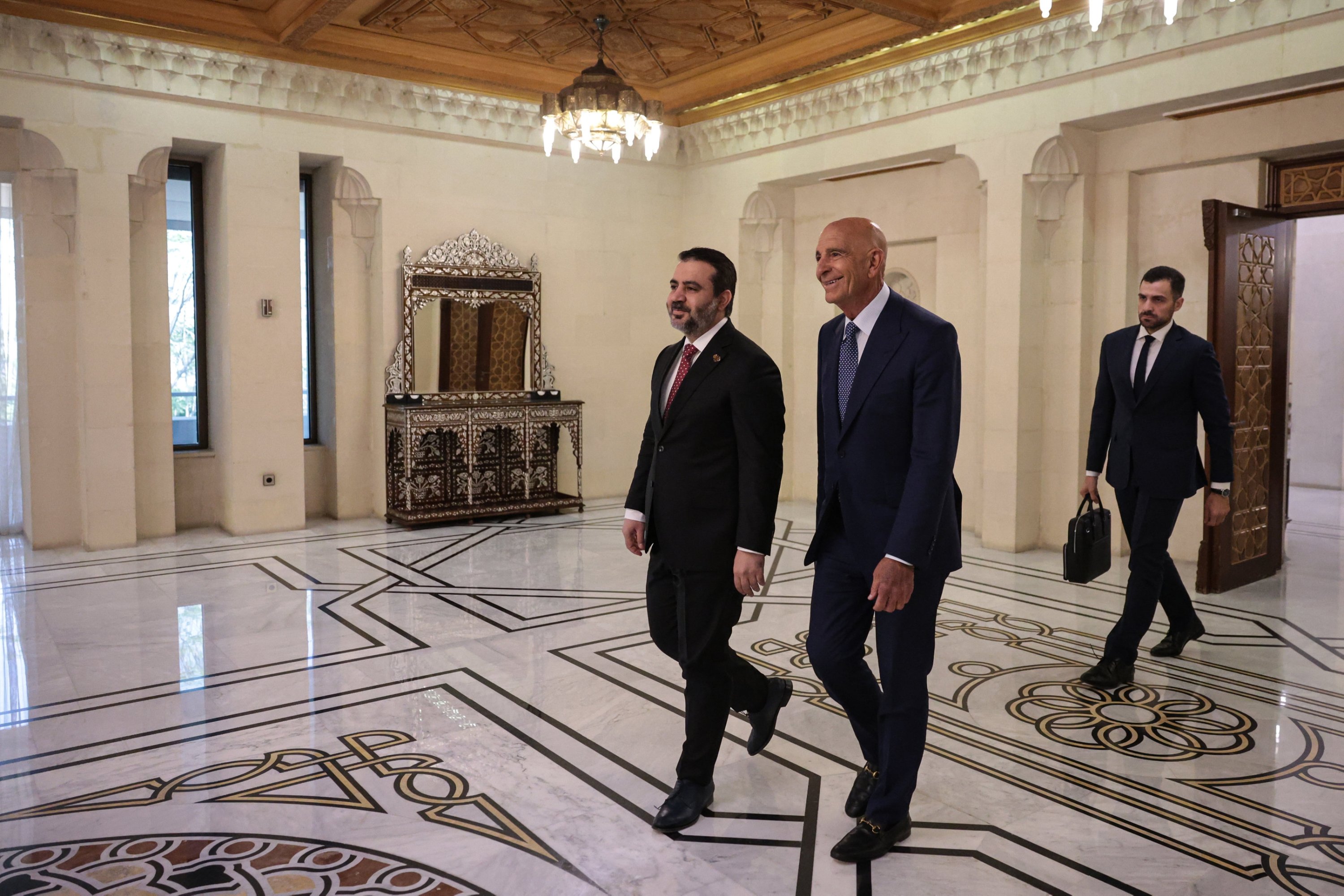 Syria's Foreign Minister Asaad al-Shaibani (L) meets U.S. Ambassador to Türkiye and Special Envoy for Syria Tom Barrack, Damascus, Syria, July 9, 2025.  (EPA Photo)