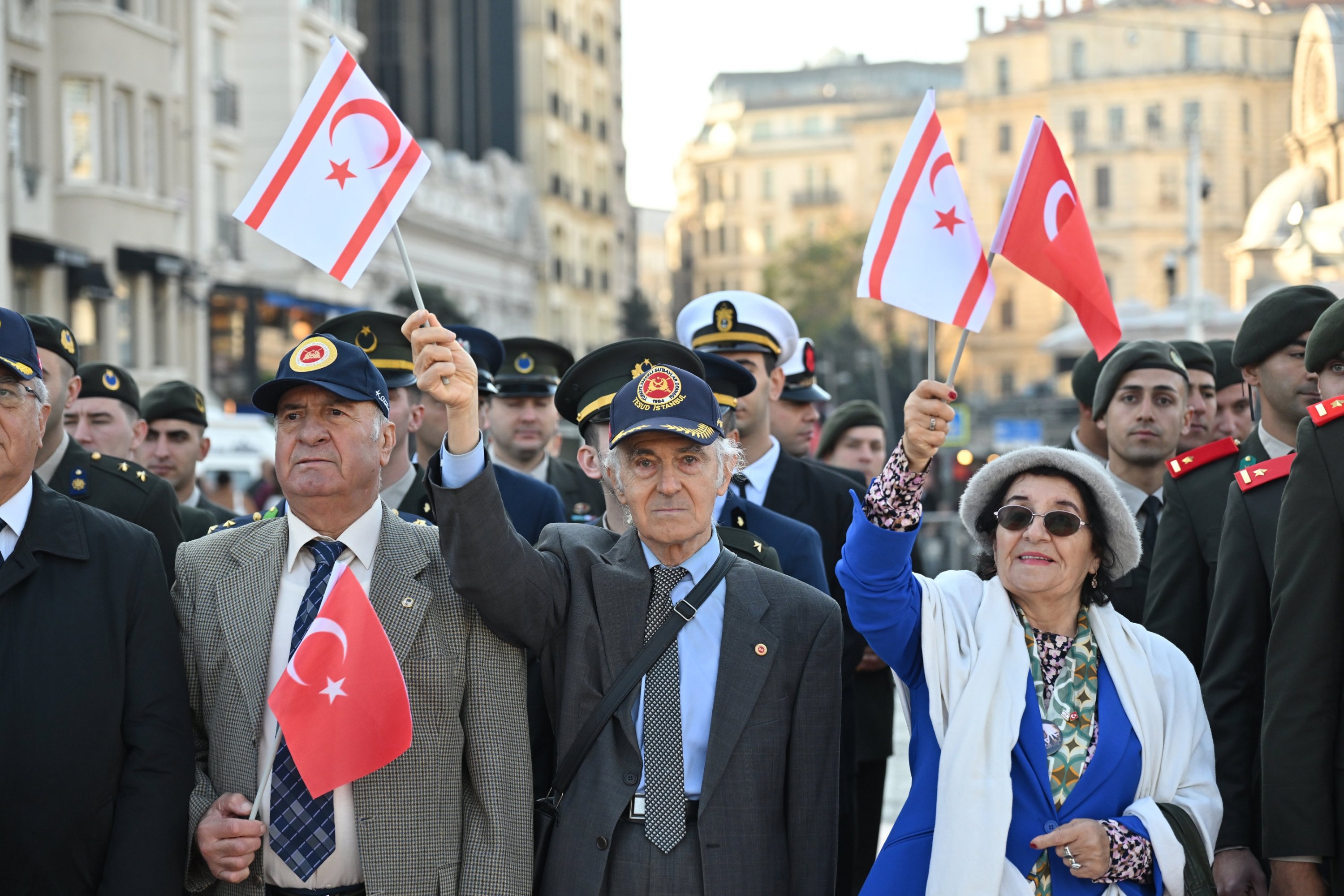 Veterans hold flags of Türkiye and the Turkish Republic of Northern Cyprus (TRNC) during a parade for TRNC's founding in Istanbul, Türkiye, Nov. 15, 2025. (AA Photo)