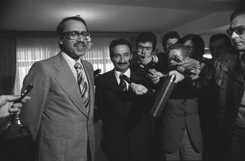 Democrat Party President Ferruh Bozbeyli (L), with then-Prime Minister Bülent Ecevit speaking to members of the press, July 1, 1977.