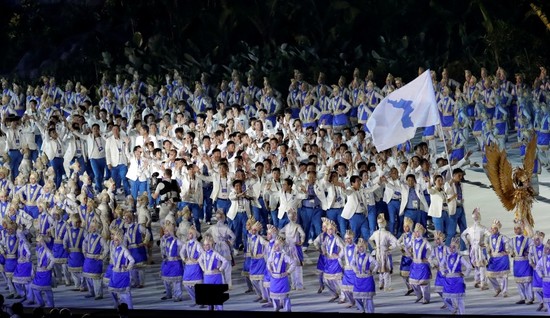 It was a virtual repeat of the joint march involving athletes from the North and South during the Winter Olympics in February in the South Korean ski resort of Pyeongchang — but without the gloves, parkas and fur hats.