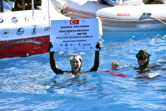 National sportswoman and world record-holding diver Şahika Ercümen on Friday broke the world record in free freshwater diving in Lake Salda in southwestern Turkey.