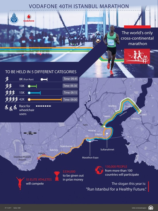 Around 30,000 professional runners, including 3,500 foreigners from more than 100 countries, will take part in the 40th Vodafone Istanbul Marathon. About 5,000 runners -- more than half of them foreigners -- will compete in the 42-kilometer marathon.