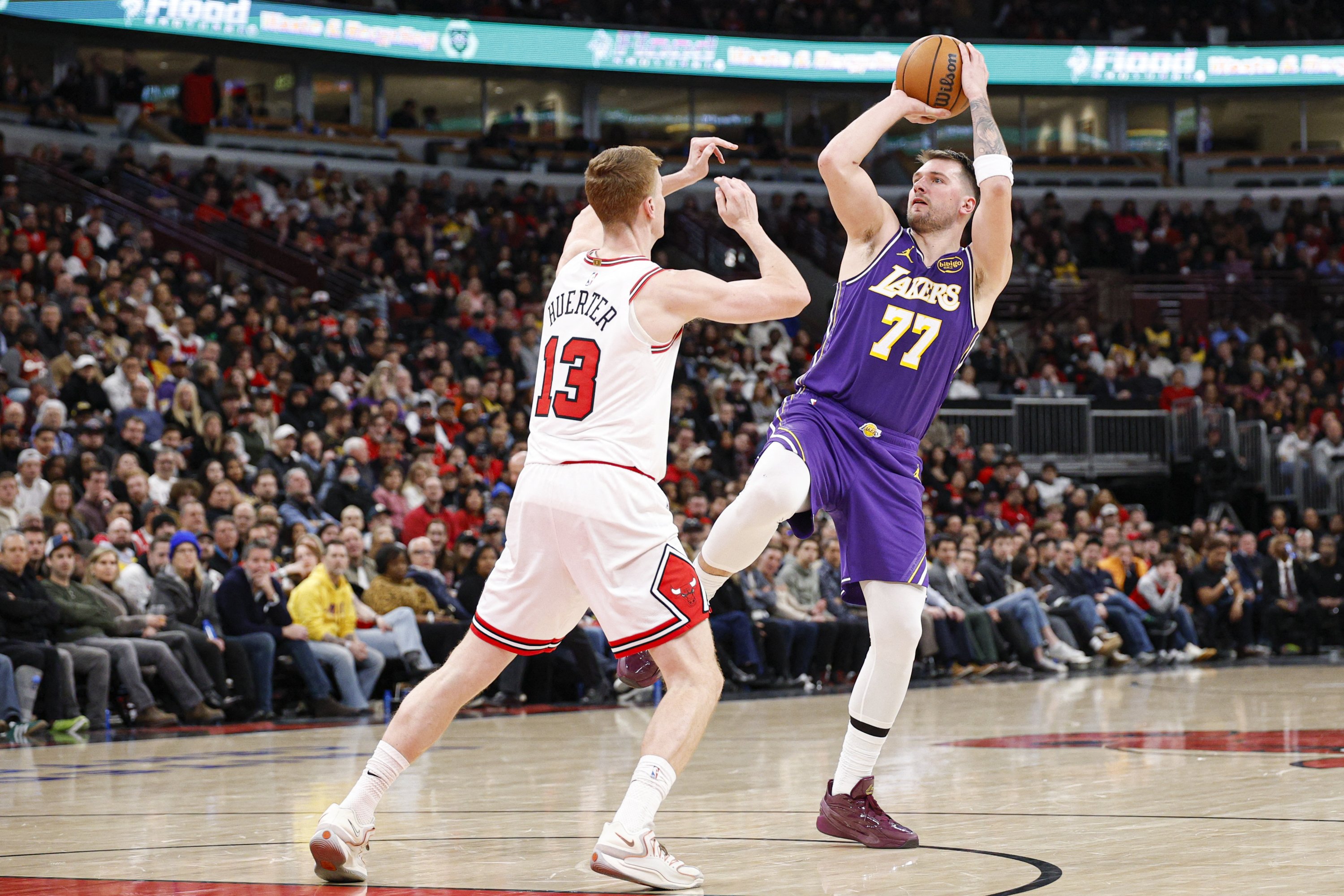 Luka Doncic erupted for 46 points and 12 assists, and LeBron James added 24 as the Los Angeles Lakers pulled away for a 129-118 victory over the Chicago Bulls on Monday night.