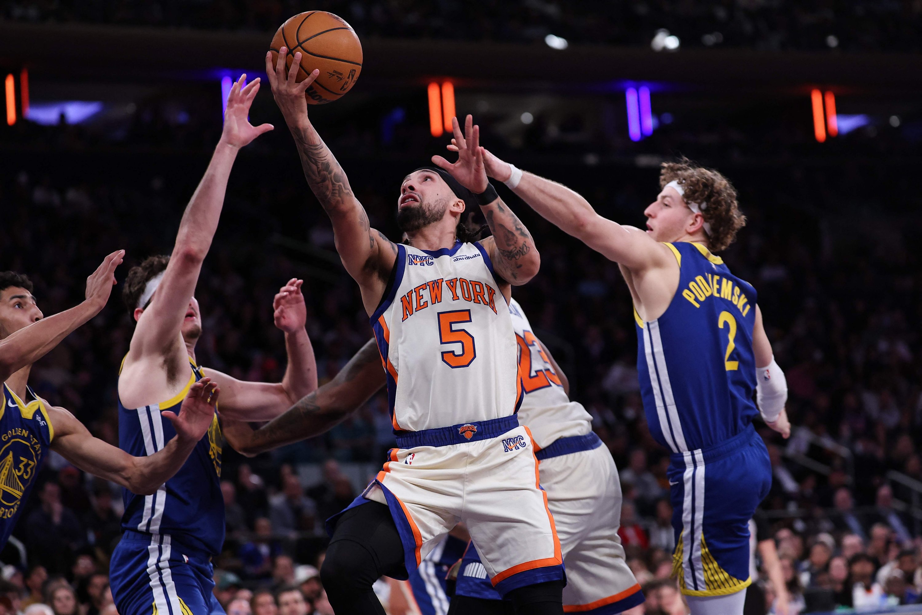 The Knicks never trailed in the fourth, though the Warriors pulled within one three times in the final 2:04.