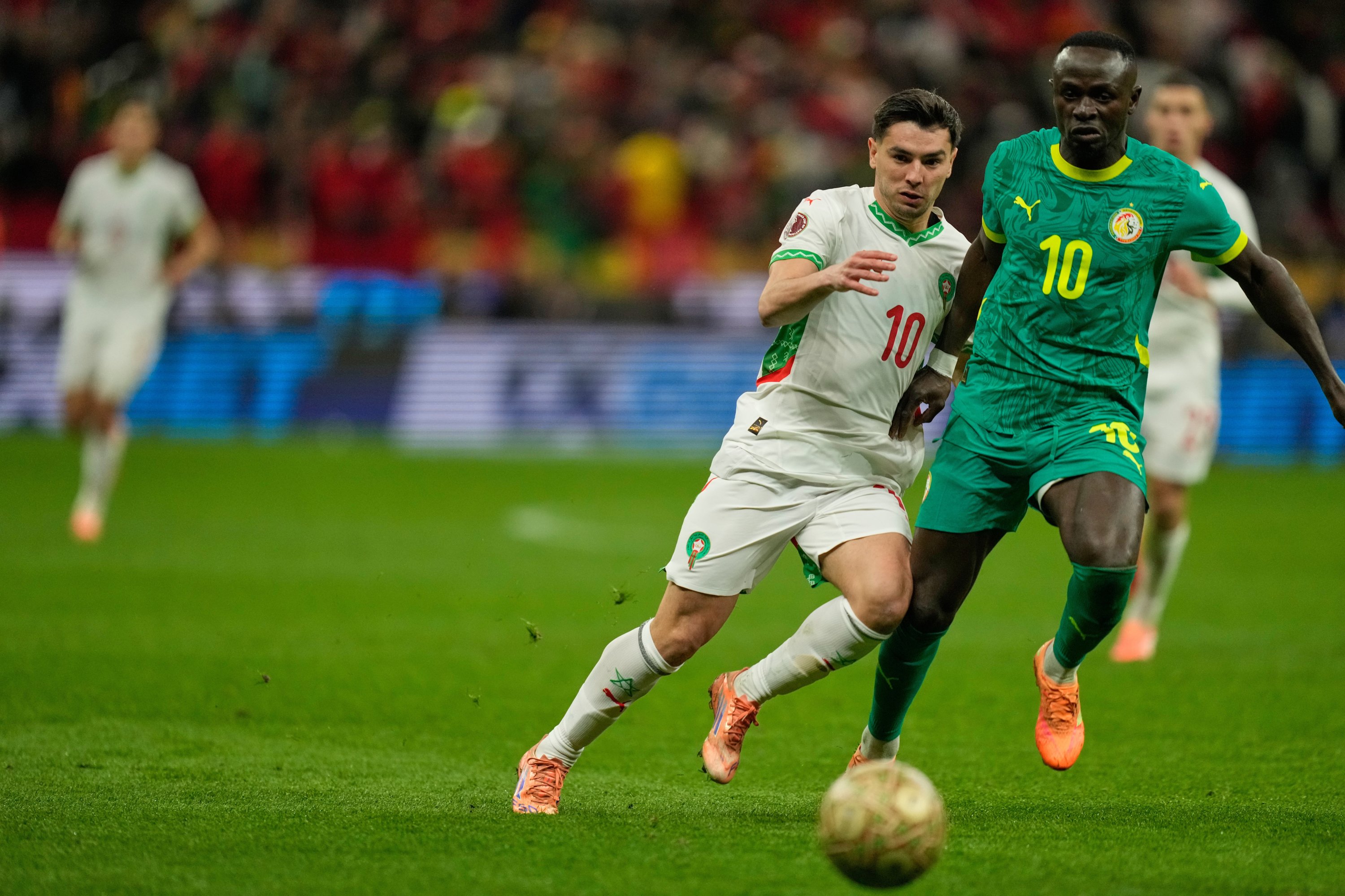 Morocco's Brahim Diaze, left, and Senegal's Sadio Mane fight for the ball during the Africa Cup of Nations final match between Senegal and Morocco, Rabat, Morocco, Jan. 18, 2026. (AP Photo)