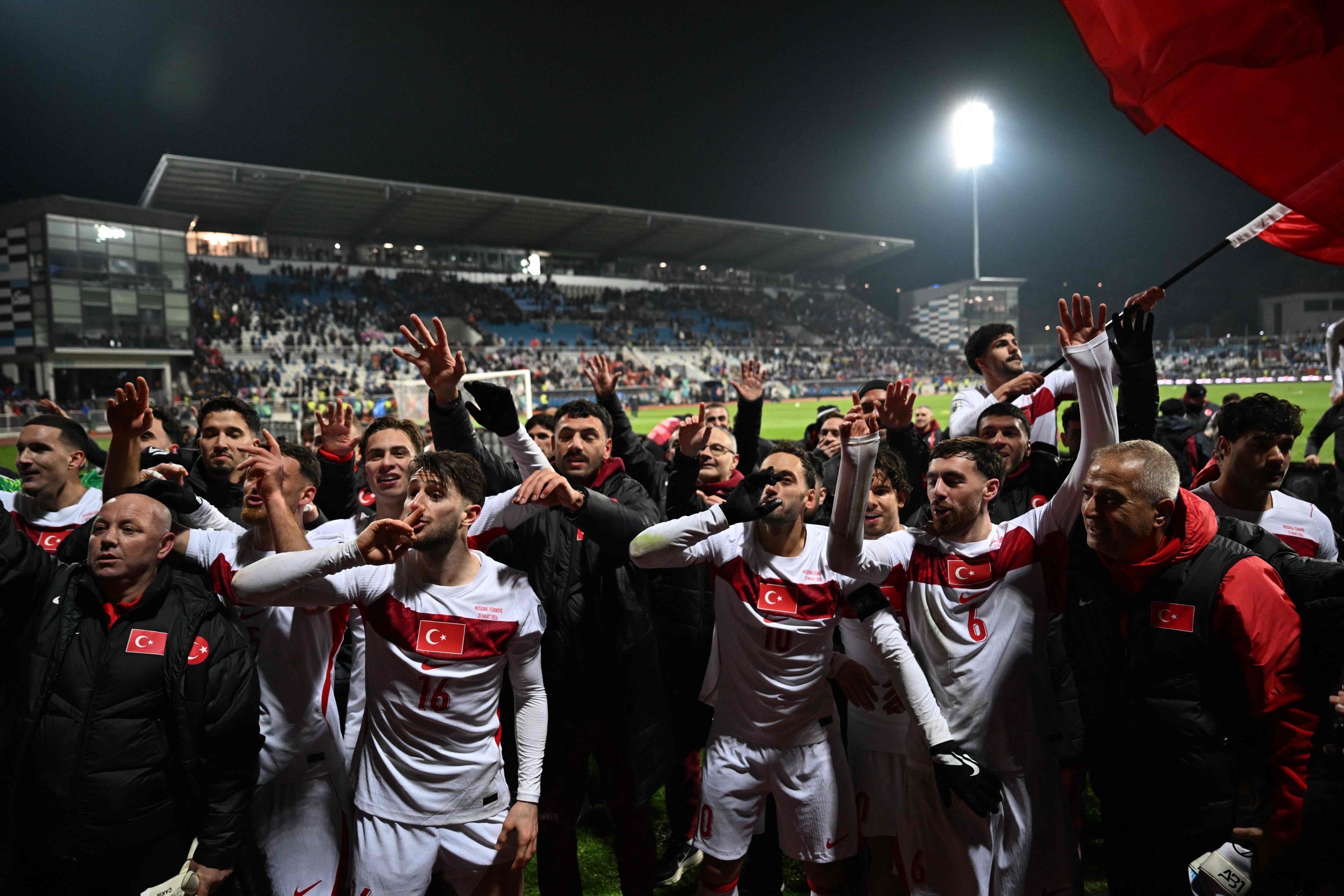 Türkiye's players celebrate after winning at the end of the FIFA World Cup 2026 European qualification final football match against Kosovo at the Fadil Vokrri stadium, Pristina, March 31, 2026. (AFP Photo)