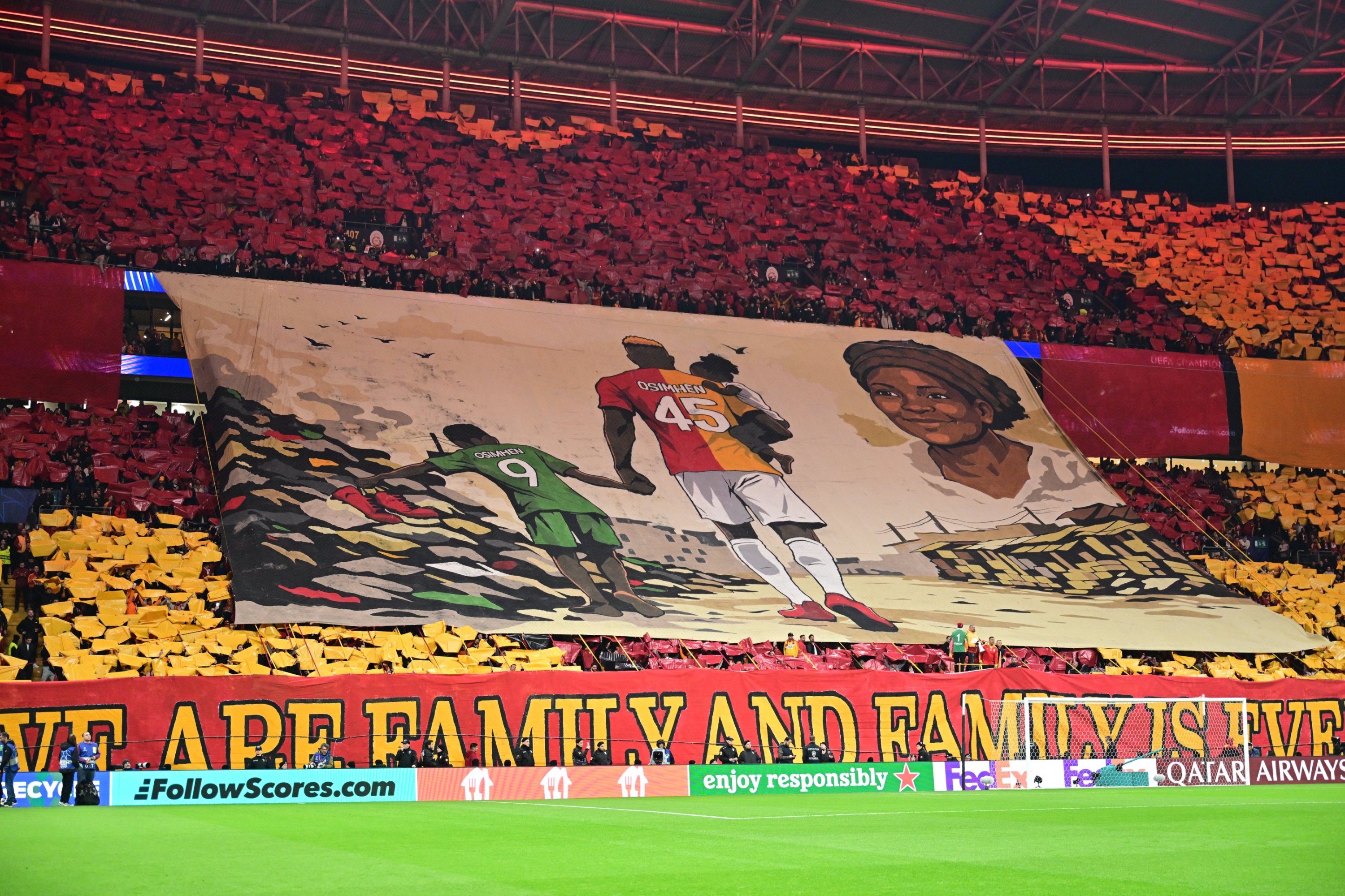 Galatasaray supporters turned a Champions League night into an emotional tribute on Wednesday, unveiling a powerful choreography for Victor Osimhen before the club’s last-16 clash with Liverpool.