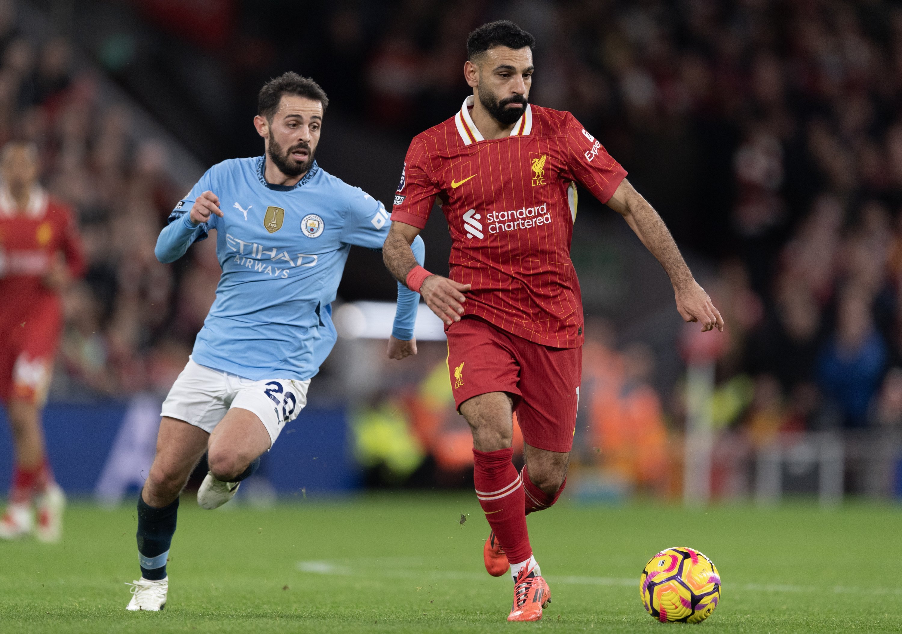 Liverpool's Mohamed Salah (R) and Manchester City's Bernardo Silva in action during the Premier League match at Anfield, Liverpool, U.K., Dec. 1, 2024. (Getty Images Photo)
