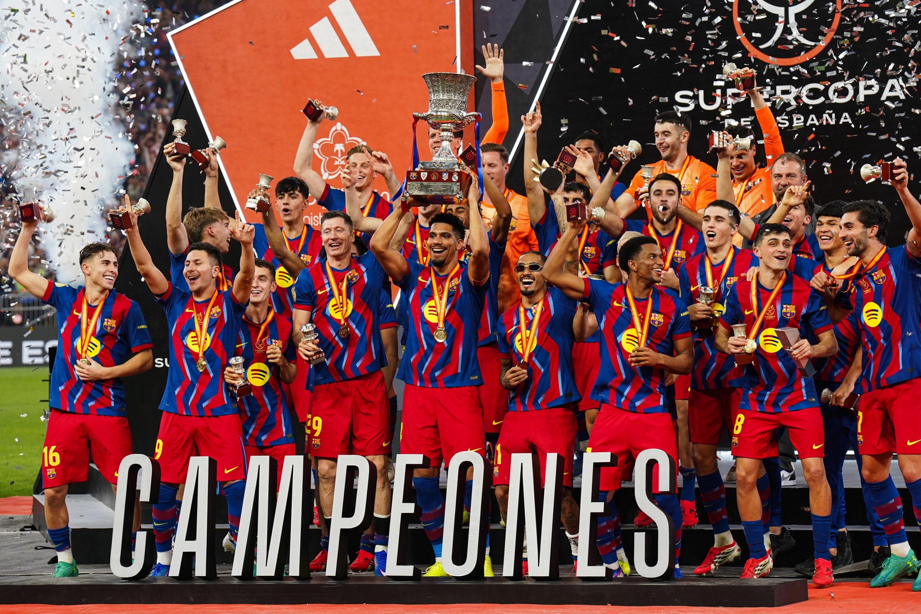 Barcelona's players raise the trophy as they celebrate after winning the Spanish Super Cup final football match against Real Madrid at the King Abdullah Stadium, Jeddah, Saudi Arabia, Jan. 11, 2026. (AA Photo)