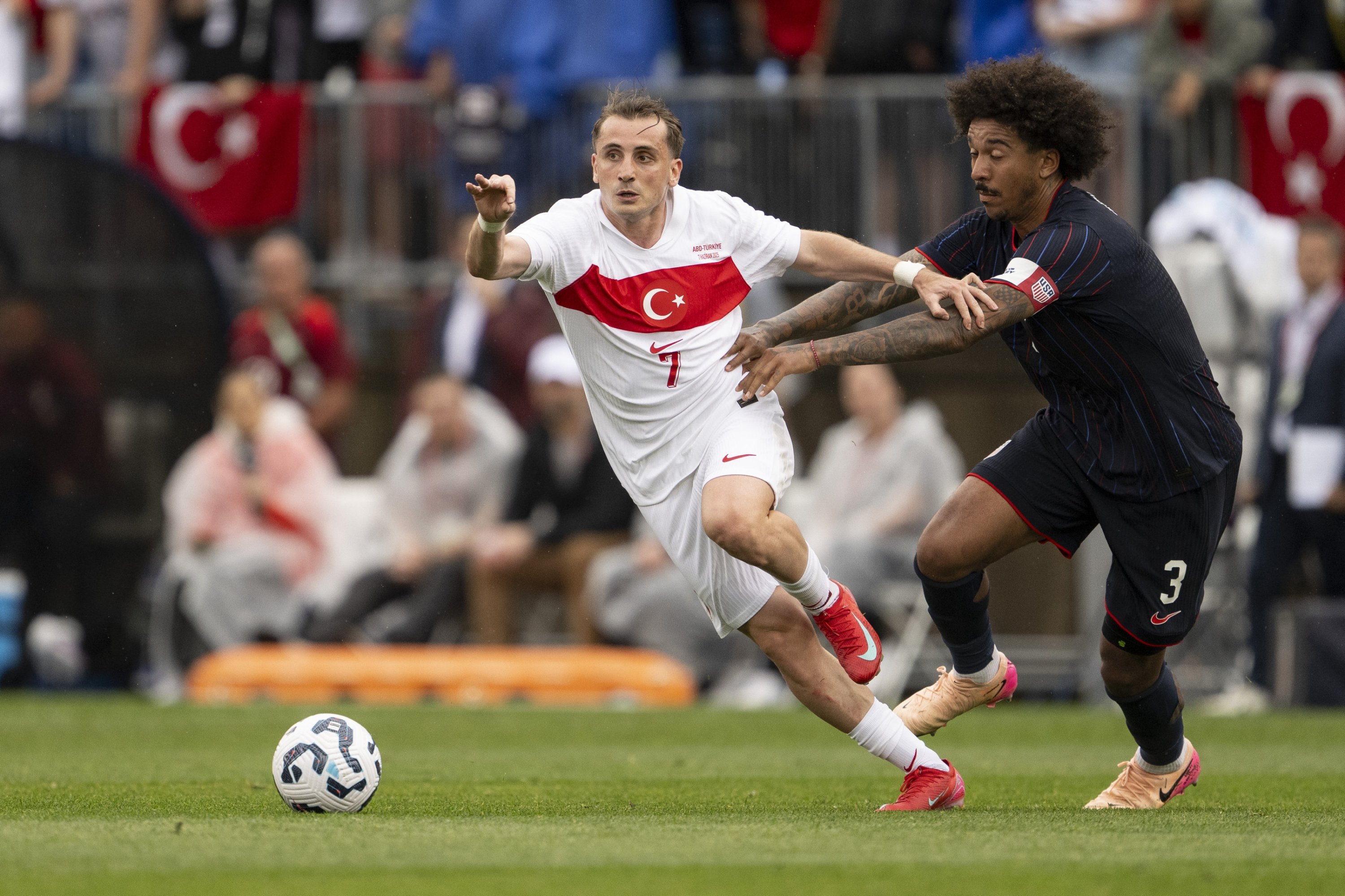 Turkish national team player Kerem Aktürkoğlu (L) gets past USA defender Chris Richards,  in East Hartford, Connecticut, U.S., June 7, 2025. (AA Photo)