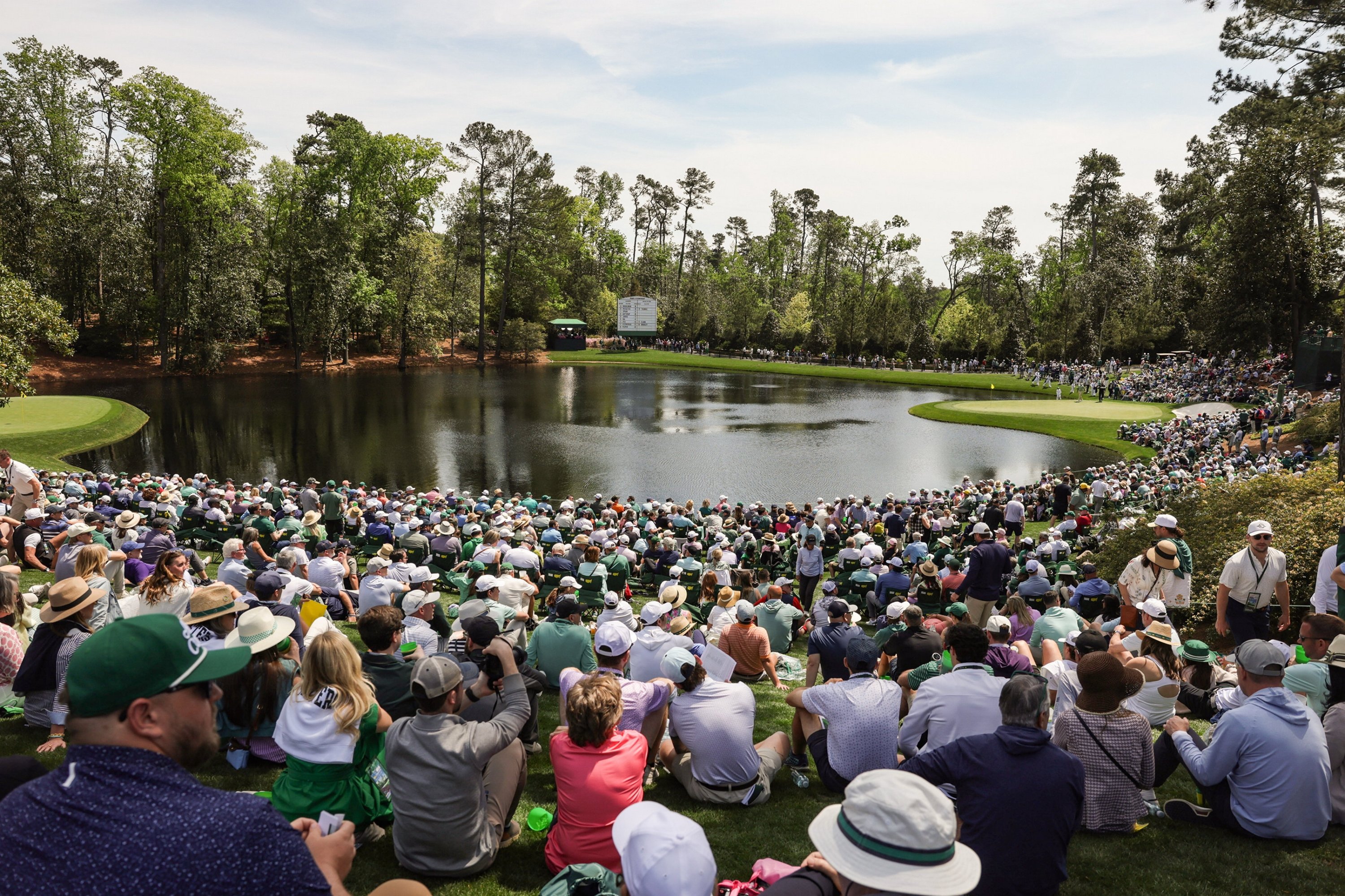 Patrons gather at the lake near the ninth hole during the Par 3 Contest during the 2026 Masters Tournament at the Augusta National Golf Club, Augusta, U.S., April 8, 2026. (EPA Photo)