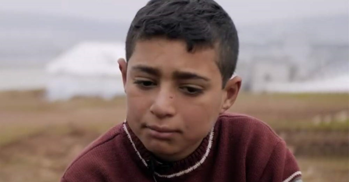 After being asked where his jacket is, the smiling Syrian boy explains in the video that he doesn't have a jacket.