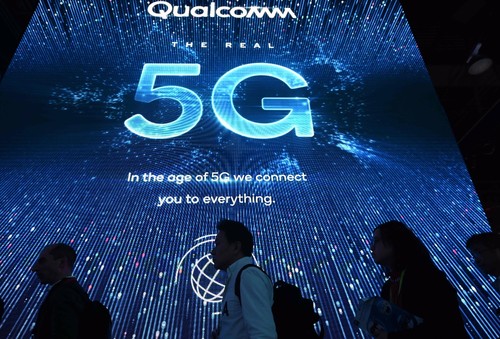 Attendees wait in line for a 5G exhibition at the Qualcomm booth during CES 2019 consumer electronics show, on Jan. 10, in Las Vegas, Nevada.