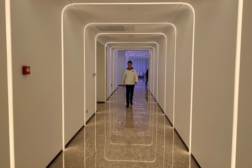 A staff member walks in the hallway during a demonstration to the media at Alibaba Group's futuristic FlyZoo hotel