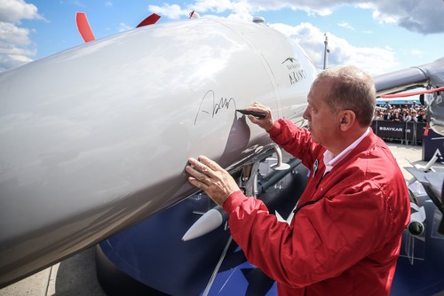 President Recep Tayyip Erdoğan signs Baykar Makina's latest armed drone Akıncı, Istanbul, Sept. 21, 2019.