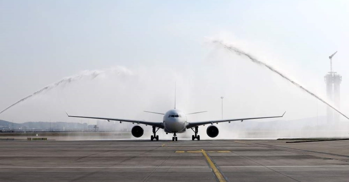 The Malaysia Airlines flight landed at the airport at noon. The Airbus A330 aircraft was welcomed with a water salute to mark the occasion.