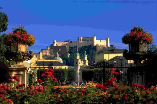 The Schloss Mirabelle was featured in the Sound of Music, a movie about an Austrian nobleman's kids and their wacky nanny, set at the dawn of the Second World War. Curlicues of flowers run along the lawn, and big dopey cupids flank unicorns and other noble figures from history frozen in stone on the borders of the gardens.