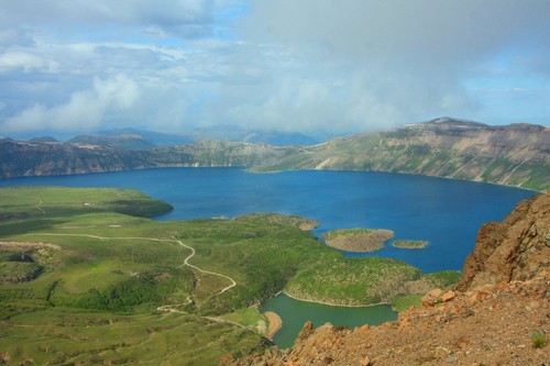 On the summit of Mount Nemrut, located in the Tatvan district of Bitlis province, Turkey's biggest lake formed after volcanic eruptions can be found. Crater Lake Nemrut is the second biggest crater lake in the world. Its location is generally mistaken with Mount Nemrut in Adıyaman province. The vapor chimneys in the crater are worth seeing. After eruptions, lava accumulations in an almost 30-kilometer area occurred. There are both hot and cold lakes in the crater of Mount Nemrut. The biggest lake is known for its blue waters and therefore called Lake Blue. The other lake has greener water and it is like a hot spring. It is said that this lakes water is good for some illnesses, such as asthma, bronchitis and rheumatism. Black glass stones that are on the roadside and shine bright when the sun reflects off of them attract a lot of interest as well. These rocks are volcanic glass (obsidian) produced after lava gets cold quickly and frozen before it has enough time to be crystallized. We completed our journey to Crater Lake Nemrut, passing among wild poplar trees which you can't see anywhere else.