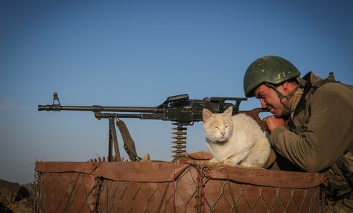 The soldiers say they were checking a cave, a favorite hideout of the PKK militants, when they came across the two animals. They say the cats boost their morale and they are so accustomed to them that they casually sleep under the machine guns and cuddle with them.