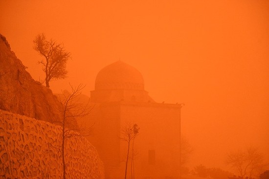 Dust clouds accompanied by muddy rain engulfed the area into darkness, even during the day. The weather is expected to continue into the evening.