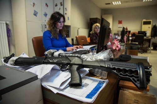 Clerks register a gun handed to the evidence room on Jan. 16, 2019.