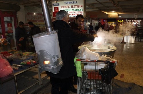 A food vendor, carries a wood stove on his back to keep himself warm in Adana, the southern city where temperatures dropped as low as 4 degrees, Jan. 15, 2019.