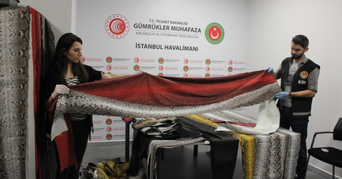 Turkish customs and anti-smuggling officers seized 93 pieces of snakeskin, which when combined reached a lengthy 355 meters, from a passenger who tried to smuggle it in checked baggage at Istanbul Airport (IST) Wednesday.
