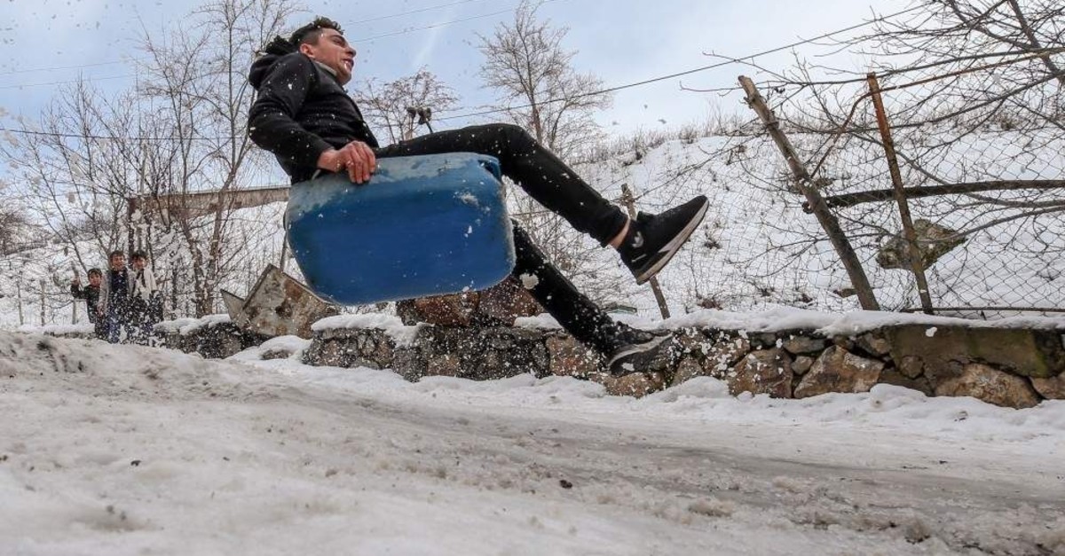 Rudimentary sleds made of wood and plastic cans split into two are all they have, but the children of Bahçesaray, a town in the eastern Turkish province of Van, make the most out of a tough winter.