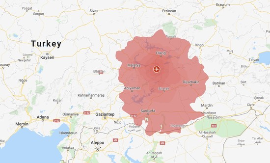 USGS data showing where the Elazığ earthquake was felt the most.