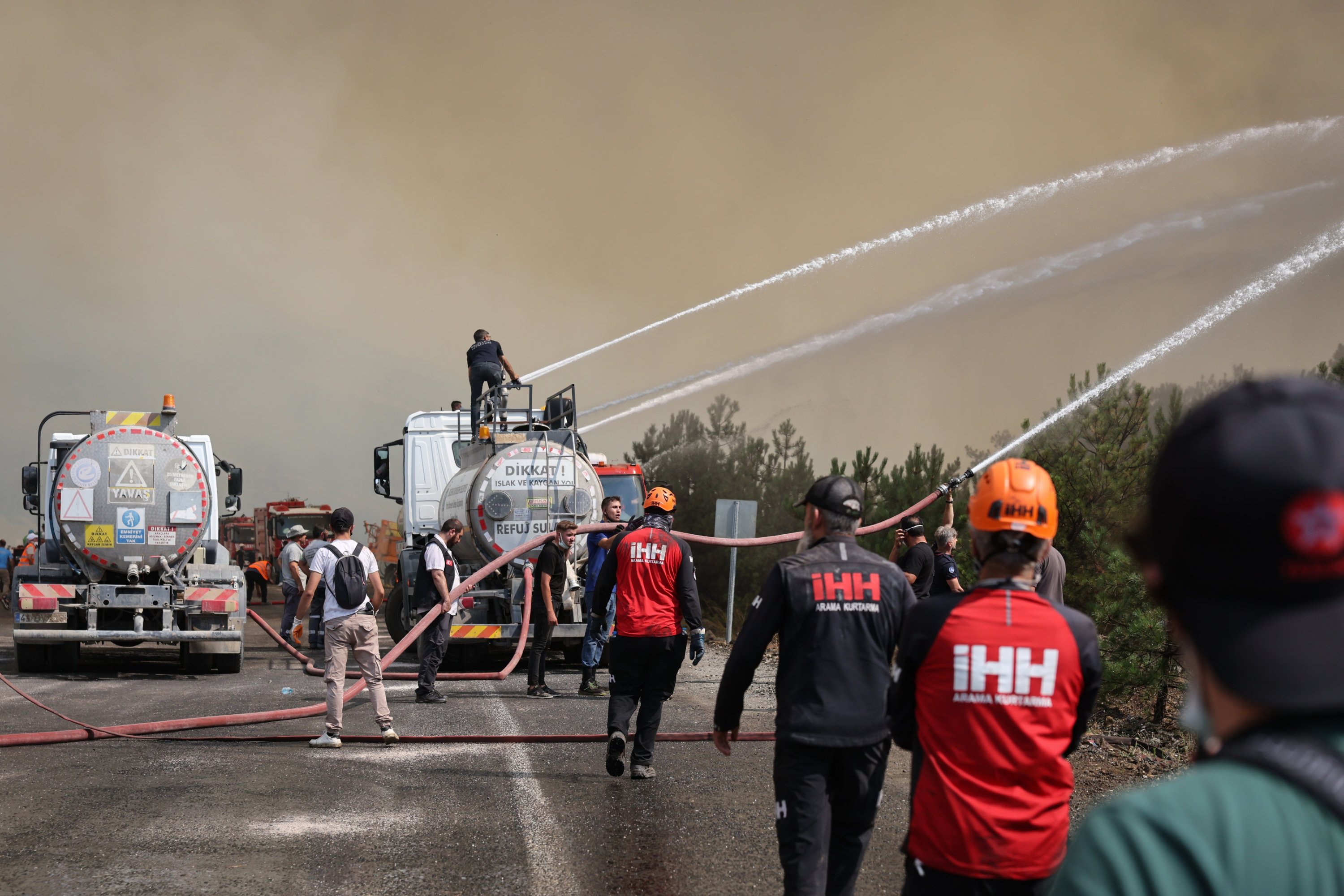 Humanitarian Relief Foundation (IHH) search and rescue teams work to control flames during a forest fire response operation in Türkiye, July 28, 2025. (AA Photo)