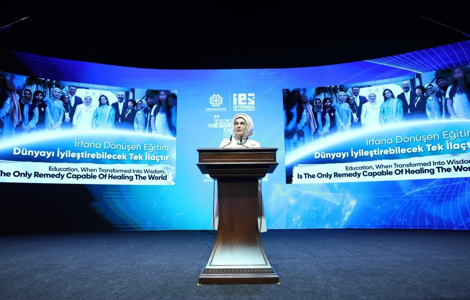 Emine Erdoğan delivering her address during the Istanbul Education Summit's opening session, Istanbul, Türkiye, Dec. 5, 2025. (Courtesy of TMV)