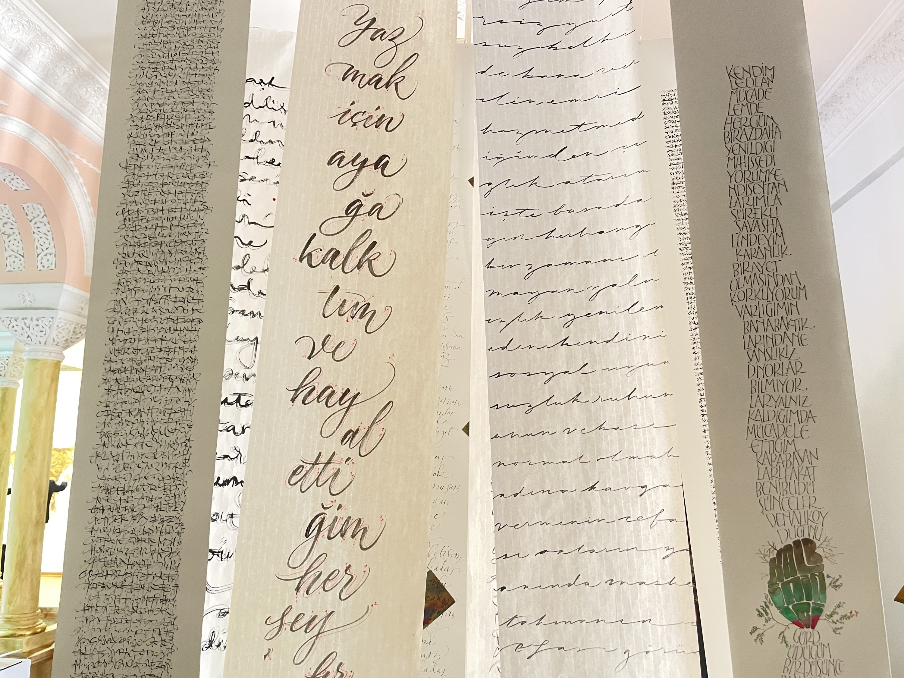 The work unfolded across paper and fabric surfaces, where calligraphic texts moved between legibility and abstraction. “Some writings could be read, while others could not,” she said, noting that many of the texts were drawn from her personal diaries. To preserve their privacy, she altered the structure of the letters. “I transformed the forms so they could no longer be read,” she explained, adding that the texts gradually became traces without fixed meaning.