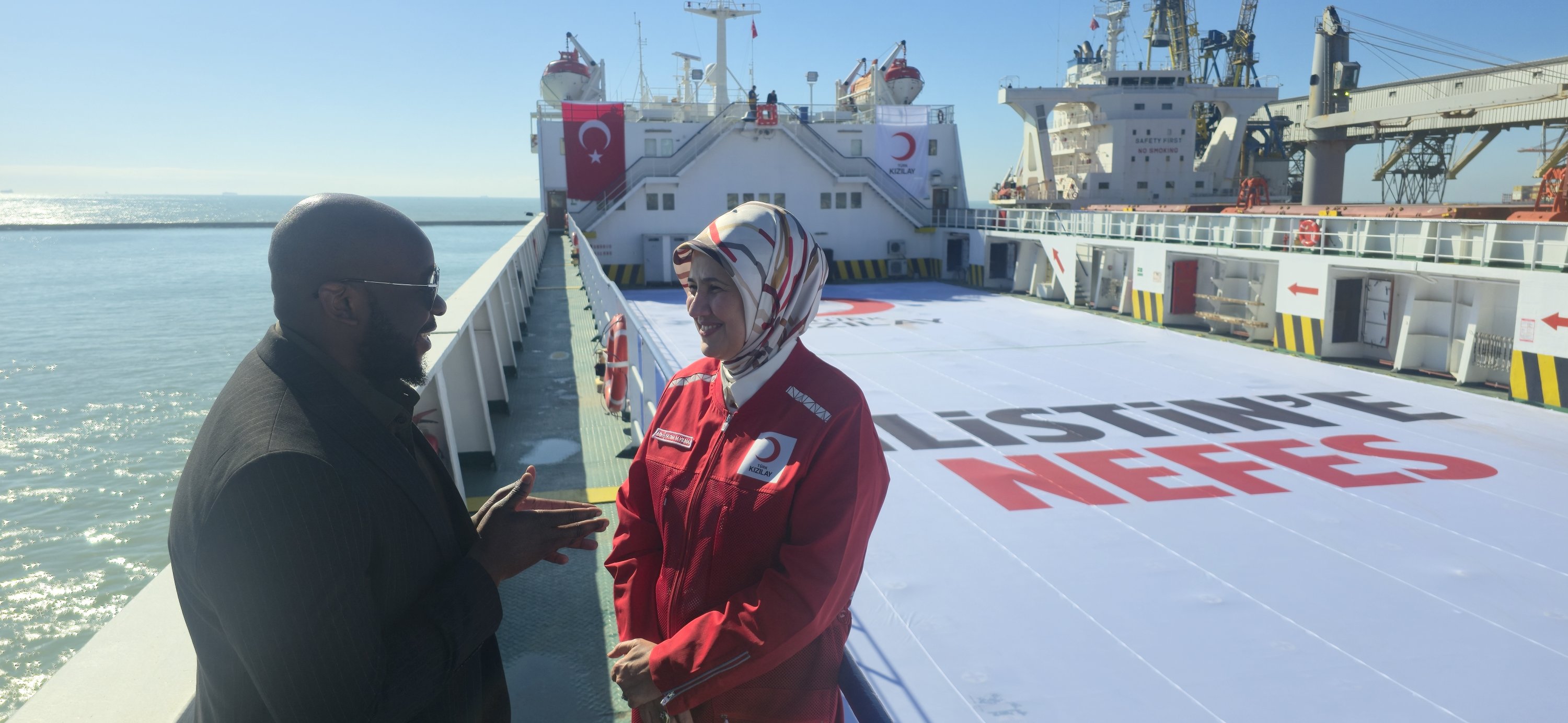 Daily Sabah editor Kelvin Ndunga (L) interviews Türk Kızılay President Fatma Meriç Yılmaz during the send-off ceremony of the 21st Ship of Goodness to Gaza, Mersin, Türkiye, Feb. 19, 2026. (Daily Sabah Photo)