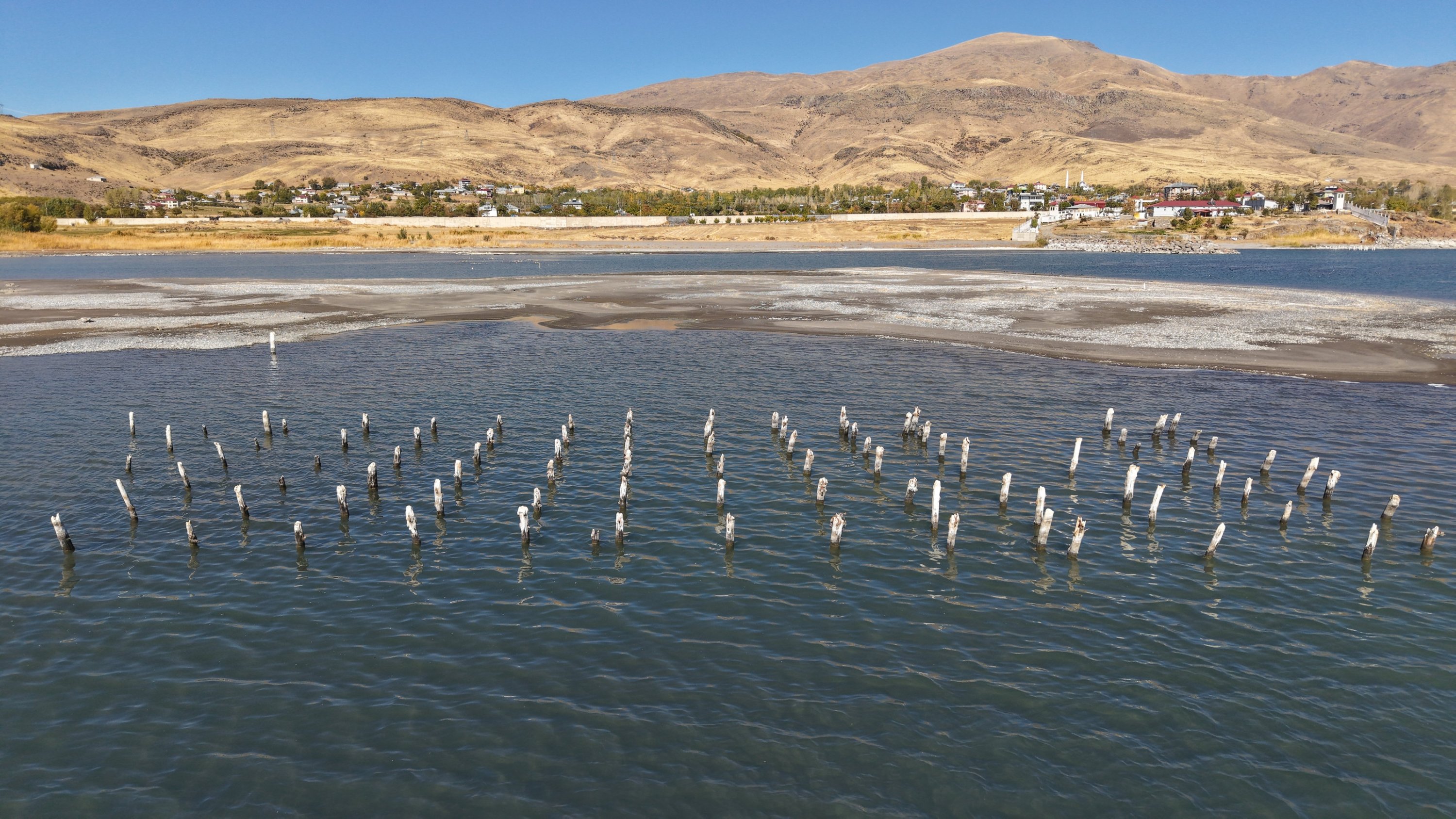 A significant decline in the water level of Lake Van has exposed the wooden supports of a century-old pier along the shore in Muradiye district, highlighting the environmental impact of climate change on the region’s largest lake.