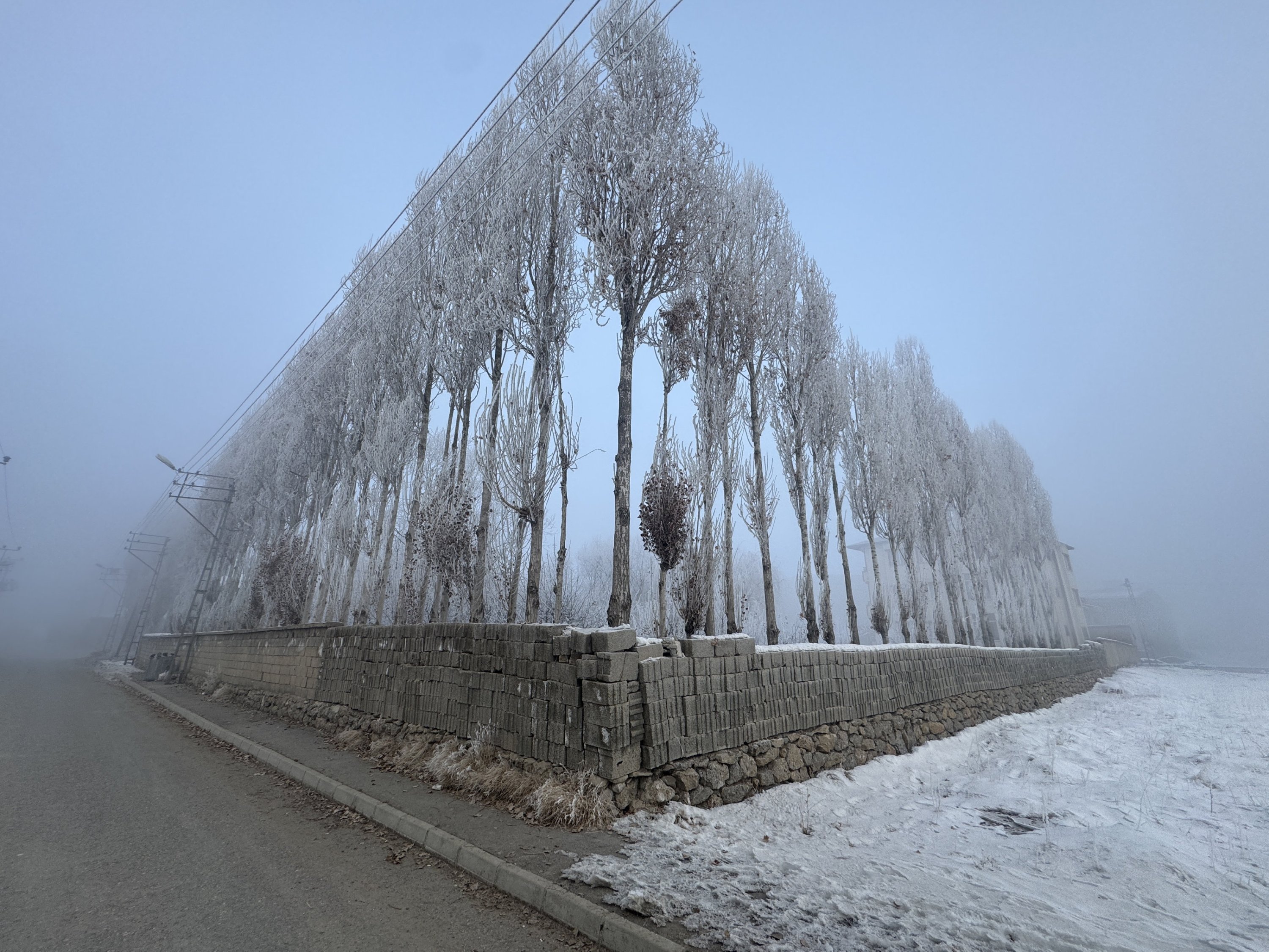 Frost coats trees during heavy fog and subzero temperatures in the Yüksekova district of Hakkari, southeastern Türkiye, Dec. 25, 2025. (AA Photo)