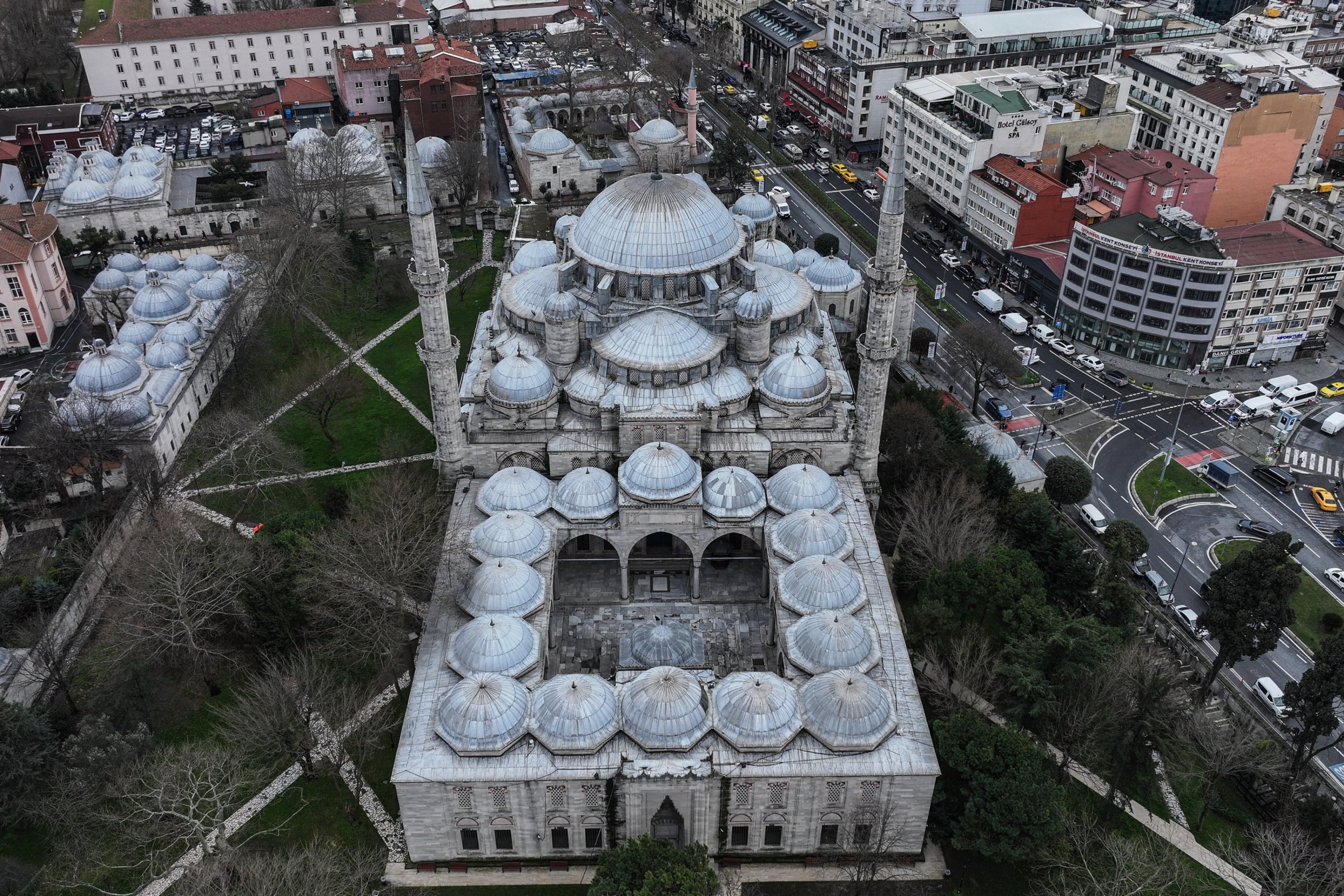 A drone view of Şehzade Mosque and its surrounding complex, highlighting the central dome, semi-domes and classical Ottoman külliye layout, Istanbul, Türkiye, Feb. 18, 2026. (AA Photo)