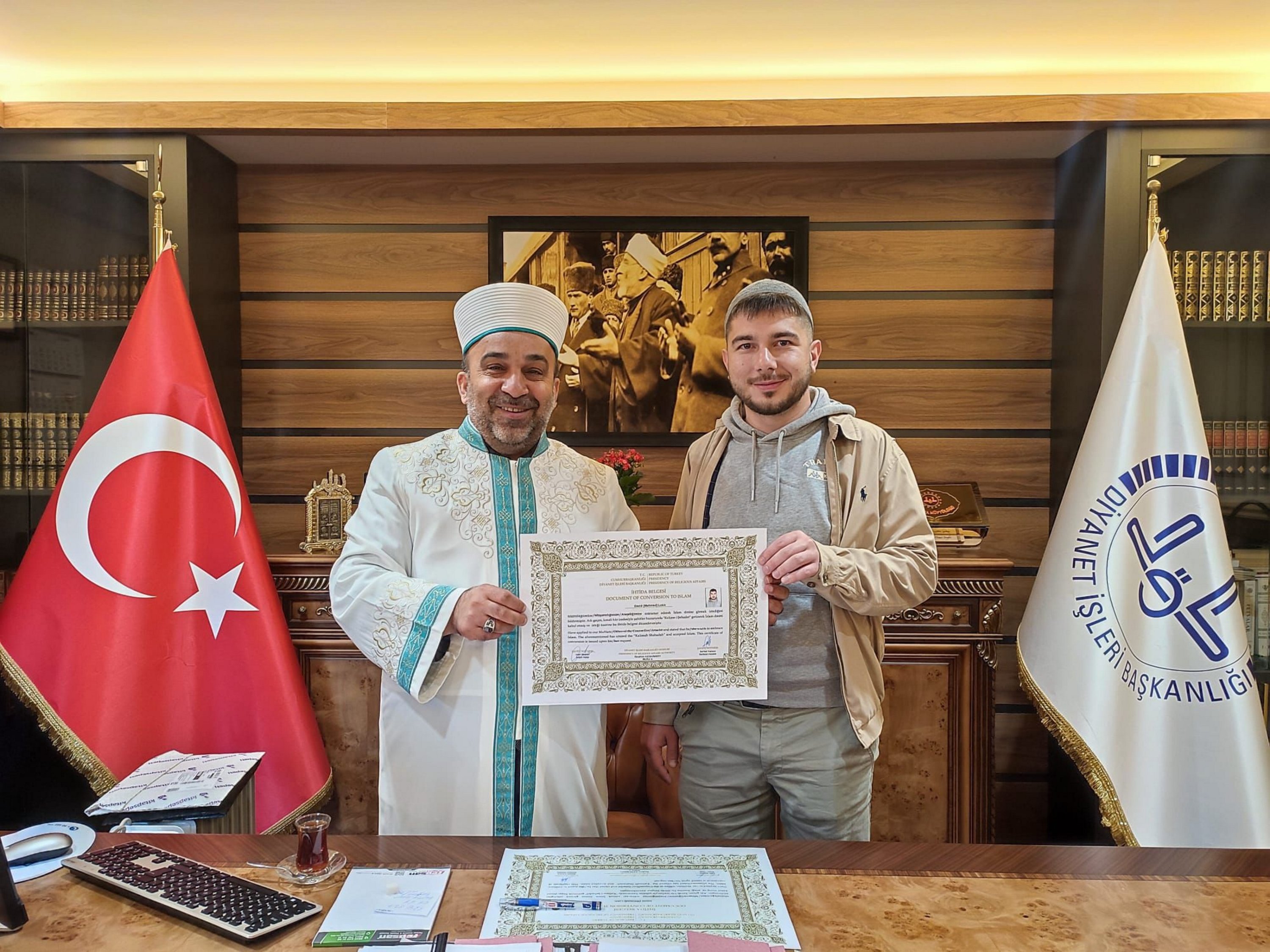 At the end of the program, he was presented with a certificate of conversion, along with publications from the Presidency of Religious Affairs (Diyanet) and a copy of the Holy Quran.